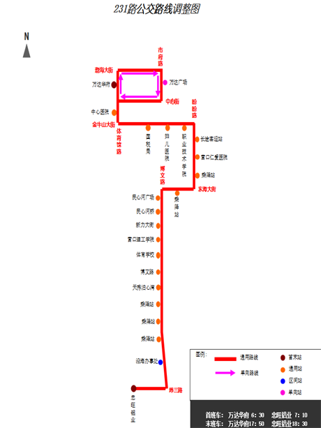 開往萬達廣場方向:7:10—7:45/17:20—18:00(經(jīng)停沿海辦事處時間預計7:13—7:48/17:23—18:03)。